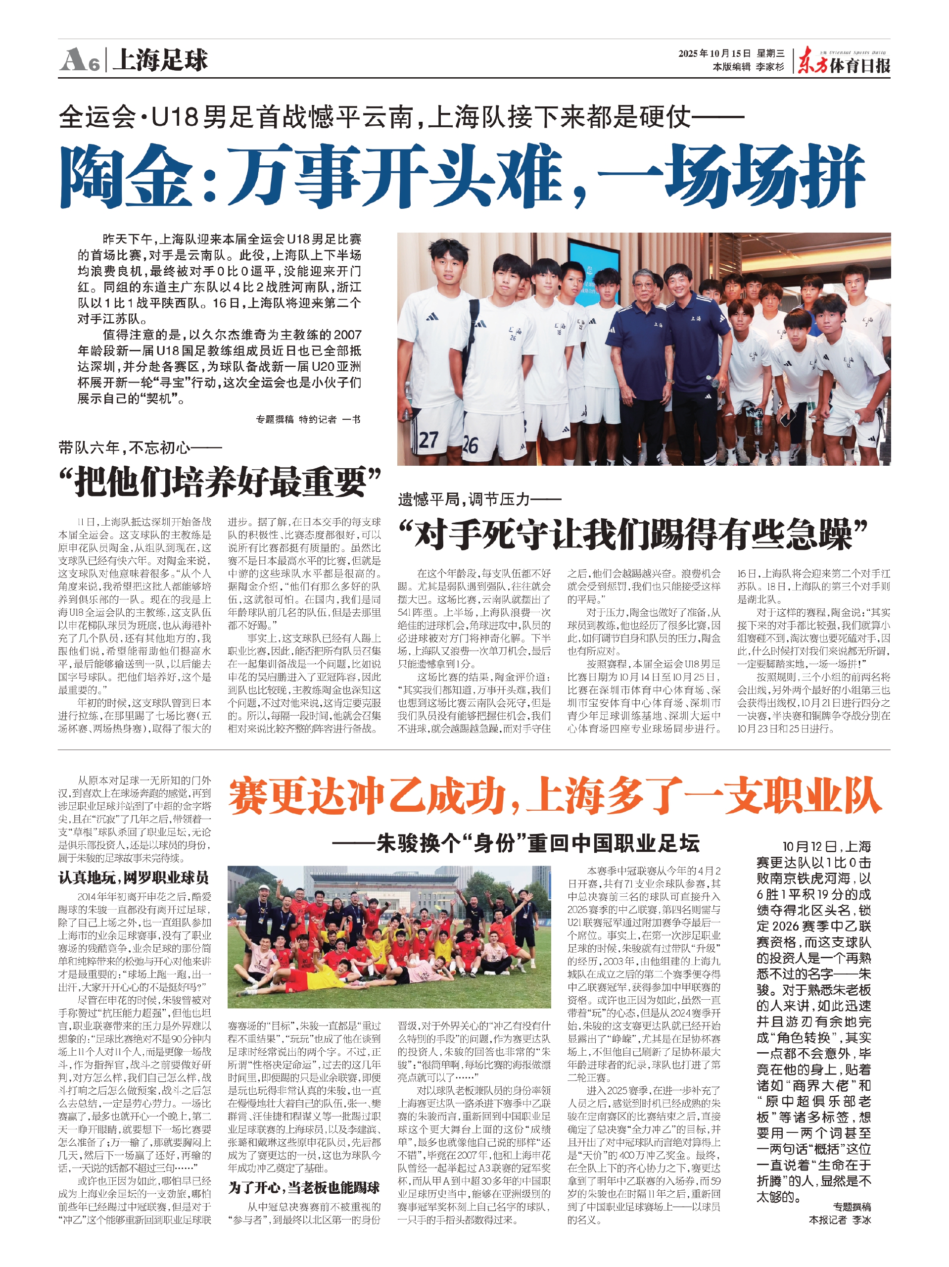 11日,上海队抵达深圳开始备战本届全运会。这支球队的主教练是原申花队员陶金,从组队到现在,这支球队已经有快六年。对陶金来说,这支球队对他意味着很多。“从个人角度来说,我希望把这批人都能够培养到俱乐部的一队。现在的我是上海U18全运会队的主教练,这支队伍以申花梯队球员为班底,也从海港补充了几个队员,还有其他地方的,我跟他们说,希望能帮助他们提高水平,最后能够输送到一队,以后能去国字号球队。把他们培养好,这个是最重要的。”
