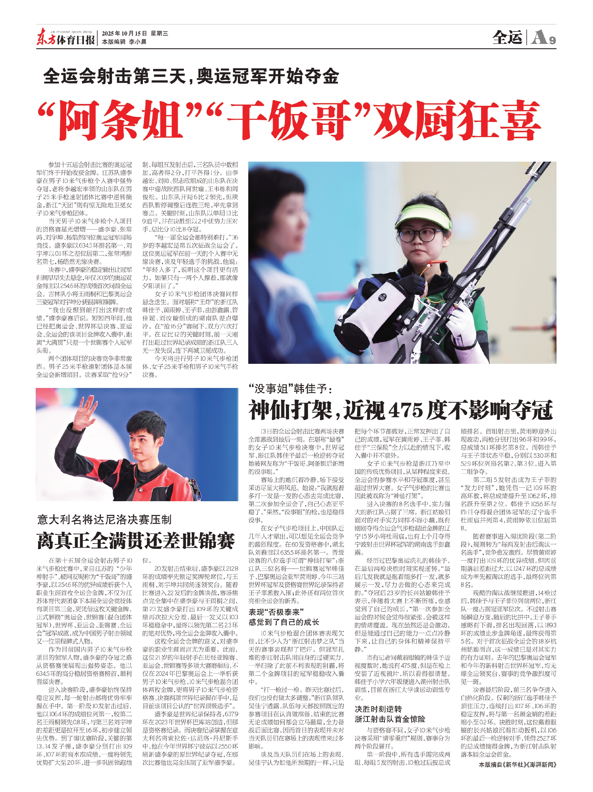 参加十五运会射击比赛的奥运冠军们终于开始收获金牌。江苏队盛李豪在男子10米气步枪个人赛中强势夺冠,老将李越宏率领的山东队在男子25米手枪速射团体比赛中逆转摘金,浙江“天团”则有惊无险地卫冕女子10米气步枪团体。