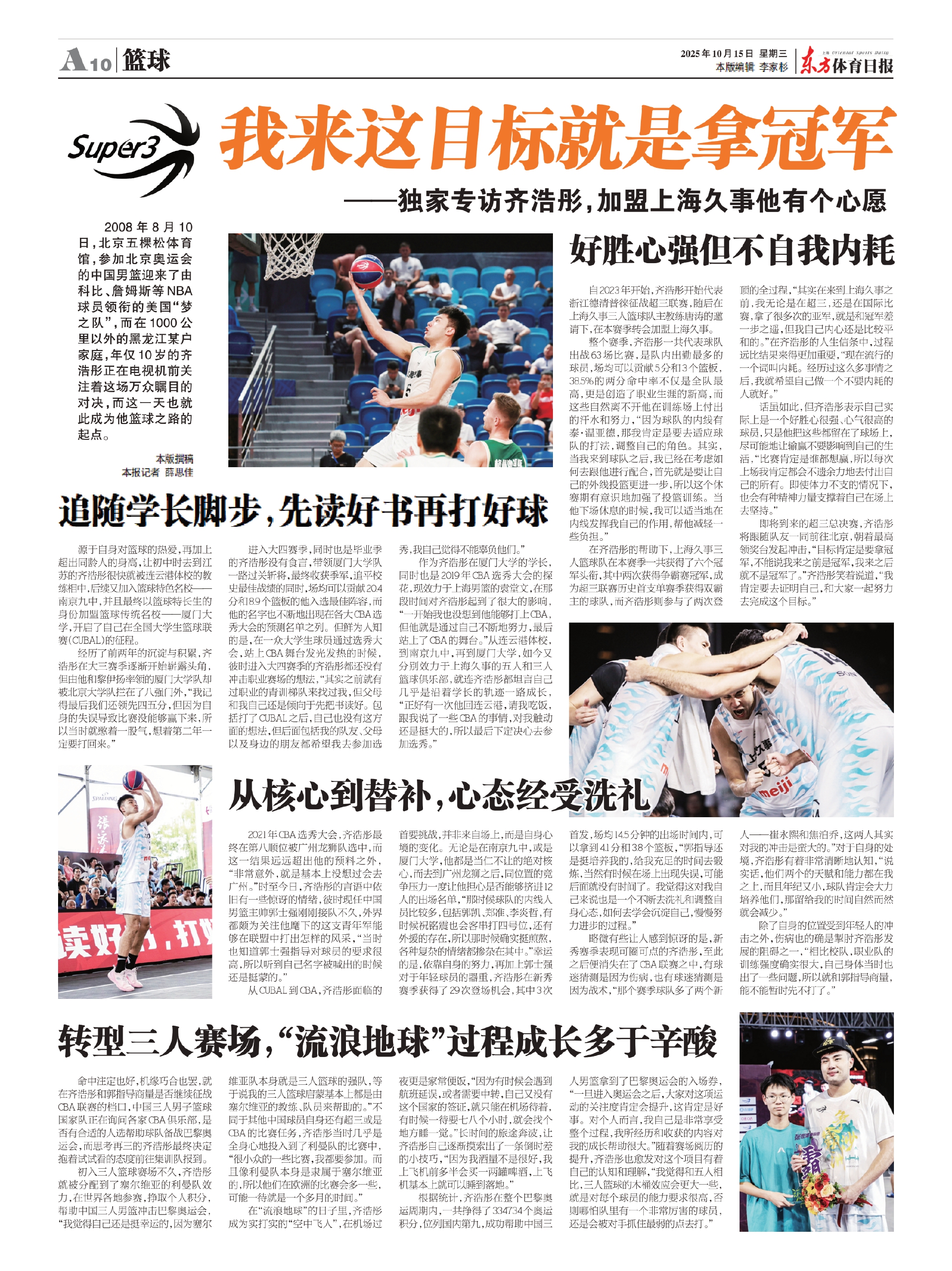 在齐浩彤的帮助下,上海久事三人篮球队在本赛季一共获得了六个冠军头衔,其中两次获得争霸赛冠军,成为超三联赛历史首支单赛季获得双霸主的球队,而齐浩彤则参与了两次登顶的全过程,“其实在来到上海久事之前,我无论是在超三,还是在国际比赛,拿了很多次的亚军,就是和冠军差一步之遥,但我自己内心还是比较平和的。”在齐浩彤的人生信条中,过程远比结果来得更加重要,“现在流行的一个词叫内耗。经历过这么多事情之后,我就希望自己做一个不要内耗的人就好。”