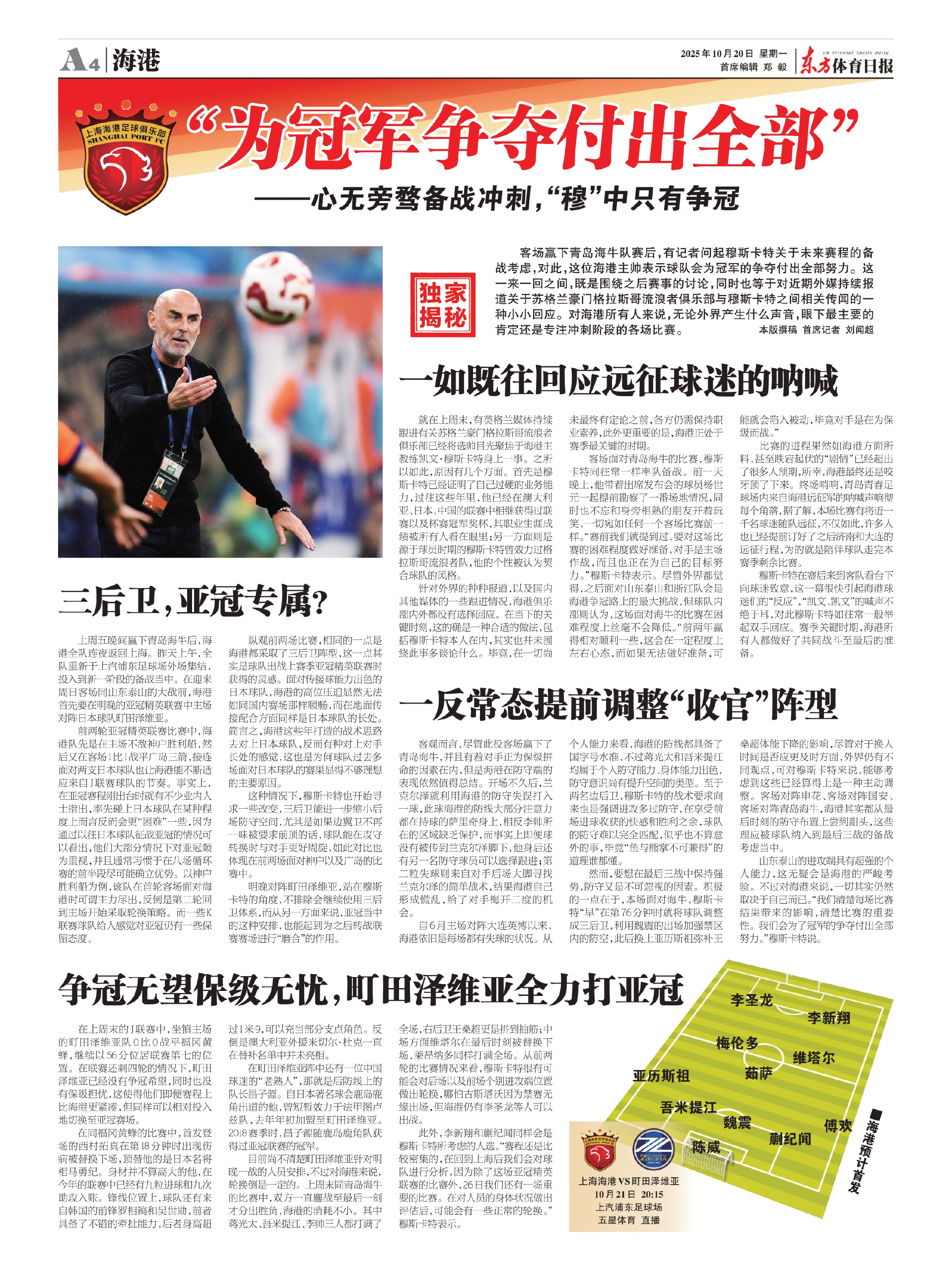 客场赢下青岛海牛队赛后,有记者问起穆斯卡特关于未来赛程的备战考虑,对此,这位海港主帅表示球队会为冠军的争夺付出全部努力。这一来一回之间,既是围绕之后赛事的讨论,同时也等于对近期外媒持续报道关于苏格兰豪门格拉斯哥流浪者俱乐部与穆斯卡特之间相关传闻的一种小小回应。对海港所有人来说,无论外界产生什么声音,眼下最主要的肯定还是专注冲刺阶段的各场比赛。 本版撰稿 首席记者 刘闻超