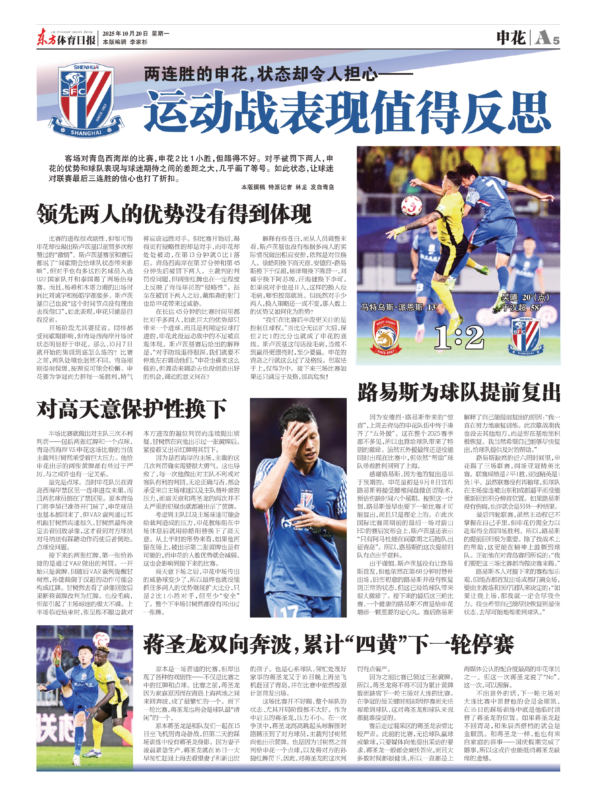 原本是一场普通的比赛,但却出现了各种的戏剧性——不仅是比赛之中的红牌和点球。比赛之前,蒋圣龙因为家庭原因而在青岛上海两地之间来回奔波,成了最繁忙的一个。而下一轮比赛,蒋圣龙也将会是球队最“清闲”的一个。