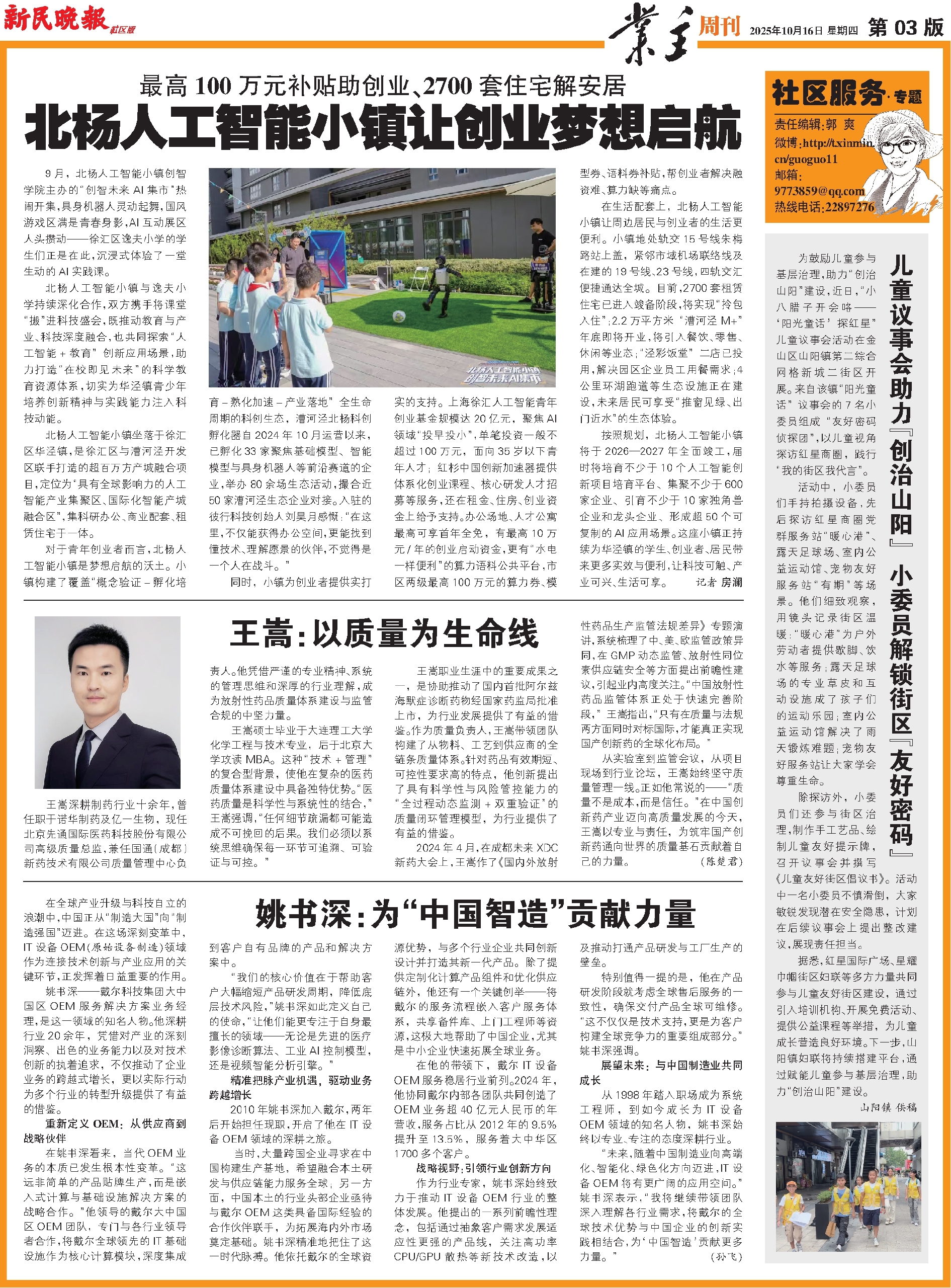 按照规划,北杨人工智能小镇将于2026—2027年全面竣工,届时将培育不少于10个人工智能创新项目培育平台、集聚不少于600家企业、引育不少于10家独角兽企业和龙头企业、形成超50个可复制的AI应用场景。这座小镇正持续为华泾镇的学生、创业者、居民带来更多实效与便利,让科技可触、产业可兴、生活可享。 记者 房澜