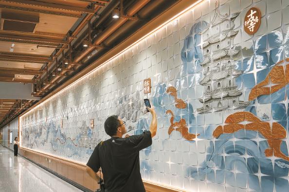 上图为该站站厅“文化灵魂”——30米长的“蟠龙十景”艺术墙