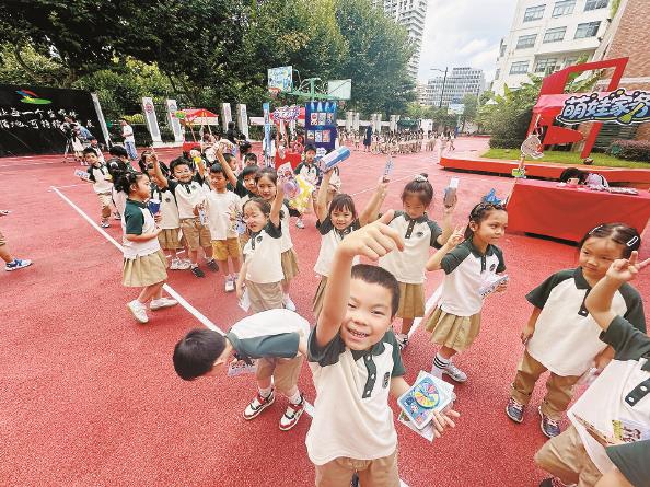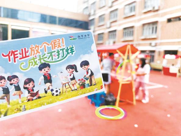 “阅言妙妙屋”“嗨玩趣味角”“乐动能量站”“一起来‘种吧’”“创想家乐园”“非遗焕彩坊”“艺享漫游行”“心灵休憩湾”“萌娃家务馆”“中华小当家”……操场上,10辆花车一字排开,摆放着游戏棋、蔬菜、科技小制作、绳子、种植盆栽、书籍等小礼物。老师们化身“摊主”,等着孩子前来挑选。教导主任陈劼说,这是为了帮助孩子们发现兴趣,学会安排自己的生活,把一天的放松时间变为一生受用的时间管理能力和综合素养,让成长在生活里发芽。
