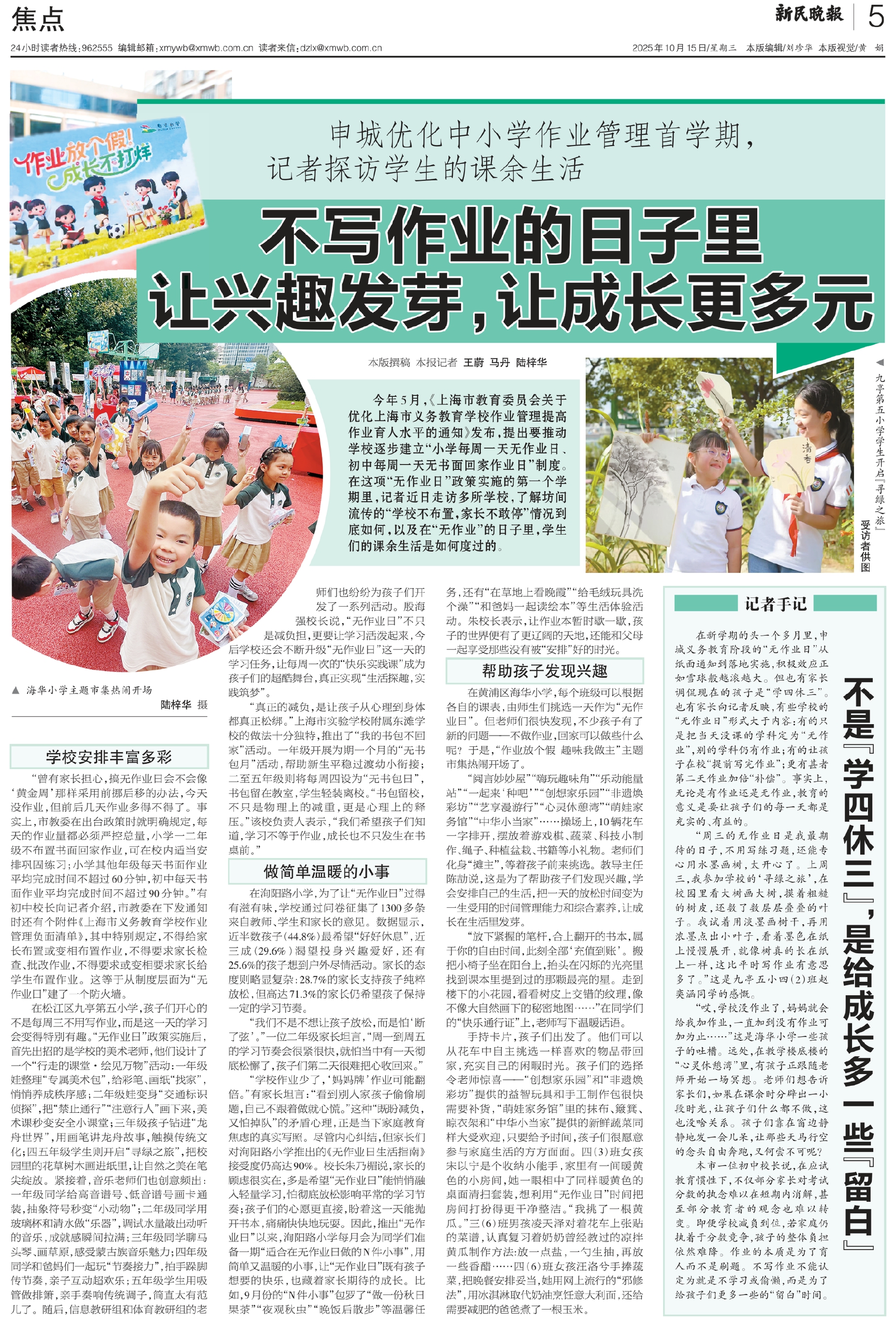 “学校作业少了,‘妈妈牌’作业可能翻倍。”有家长坦言:“看到别人家孩子偷偷刷题,自己不跟着做就心慌。”这种“既盼减负,又怕掉队”的矛盾心理,正是当下家庭教育焦虑的真实写照。尽管内心纠结,但家长们对洵阳路小学推出的《无作业日生活指南》接受度仍高达90%。校长朱乃楣说,家长的顾虑很实在,多是希望“无作业日”能悄悄融入轻量学习,怕彻底放松影响平常的学习节奏;孩子们的心愿更直接,盼着这一天能抛开书本,痛痛快快地玩耍。因此,推出“无作业日”以来,洵阳路小学每月会为同学们准备一期“适合在无作业日做的N件小事”,用简单又温暖的小事,让“无作业日”既有孩子想要的快乐,也藏着家长期待的成长。比如,9月份的“N件小事”包罗了“做一份秋日果茶”“夜观秋虫”“晚饭后散步”等温馨任务,还有“在草地上看晚霞”“给毛绒玩具洗个澡”“和爸妈一起读绘本”等生活体验活动。朱校长表示,让作业本暂时歇一歇,孩子的世界便有了更辽阔的天地,还能和父母一起享受那些没有被“安排”好的时光。
