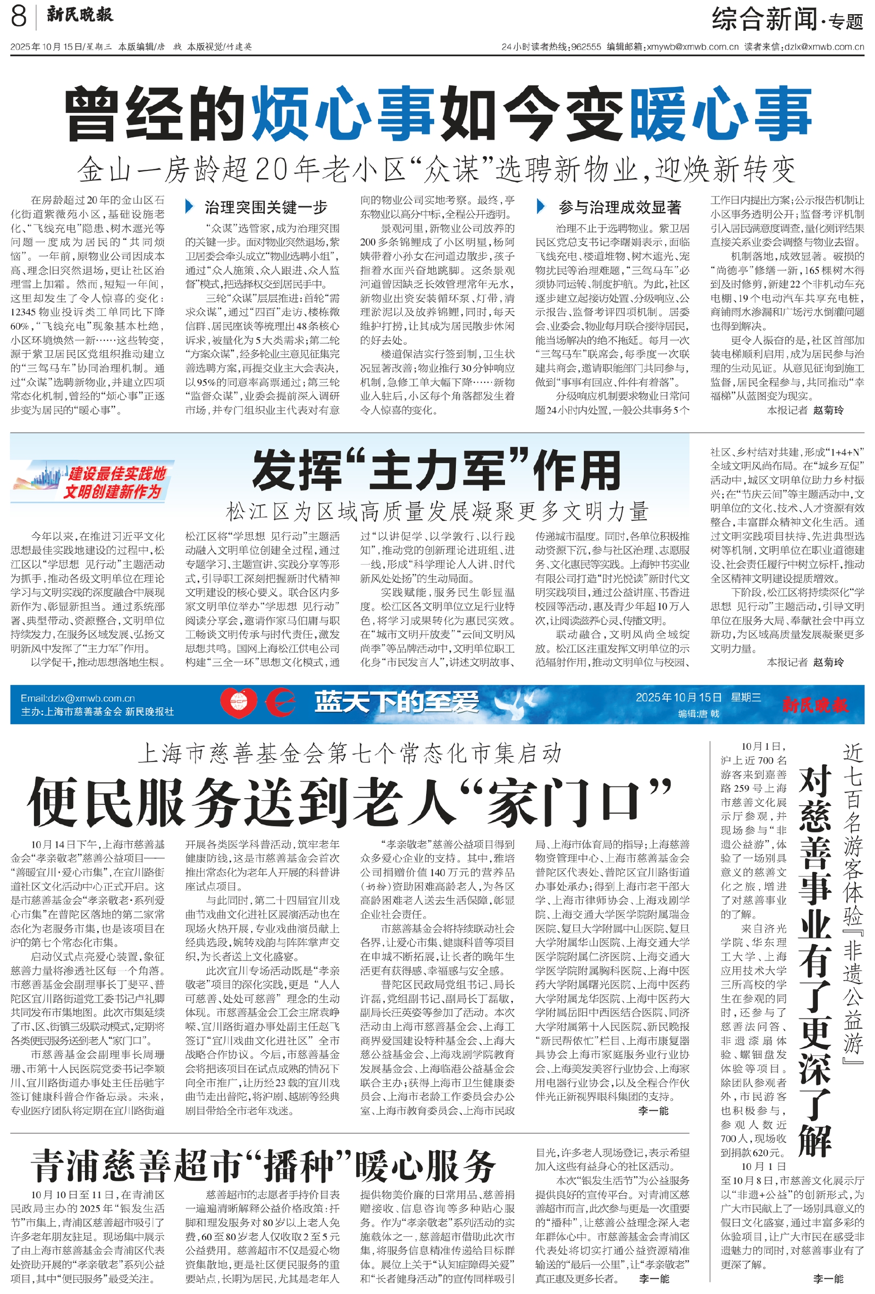 在房龄超过20年的金山区石化街道紫薇苑小区,基础设施老化、“飞线充电”隐患、树木遮光等问题一度成为居民的“共同烦恼”。一年前,原物业公司因成本高、理念旧突然退场,更让社区治理雪上加霜。然而,短短一年间,这里却发生了令人惊喜的变化:12345物业投诉类工单同比下降60%,“飞线充电”现象基本杜绝,小区环境焕然一新……这些转变,源于紫卫居民区党组织推动建立的“三驾马车”协同治理机制。通过“众谋”选聘新物业,并建立四项常态化机制,曾经的“烦心事”正逐步变为居民的“暖心事”。
