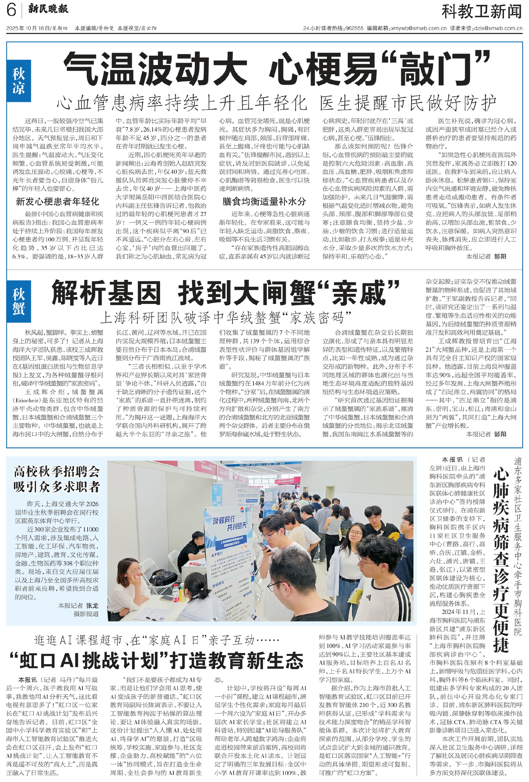 这两日,一股较强冷空气已集结完毕,未来几日将横扫我国大部分地区。天气预报显示,周日和下周申城气温跌至常年平均水平。医生提醒:气温波动大、气压变化频繁,心血管系统易受刺激,可能诱发血压波动、心绞痛、心梗等,不光年长者要当心,自诩身体“倍儿棒”的年轻人也要留心。