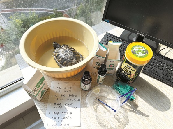 今年5月,达芬奇也开始进食异常,身上还有大面积红肿。蜀乐不敢大意,多次跑异宠医院。医生说达芬奇老了,各种功能开始退化,开了许多药。有的药一天要喂三次,每次需用细针管将乌龟的嘴掰开快速推射给药,还有两瓶药需要给它泡在水里药浴。蜀乐都按医嘱严格执行。为了按时给乌龟吃药,蜀乐买了一个便携乌龟盒每天带着达芬奇上班。