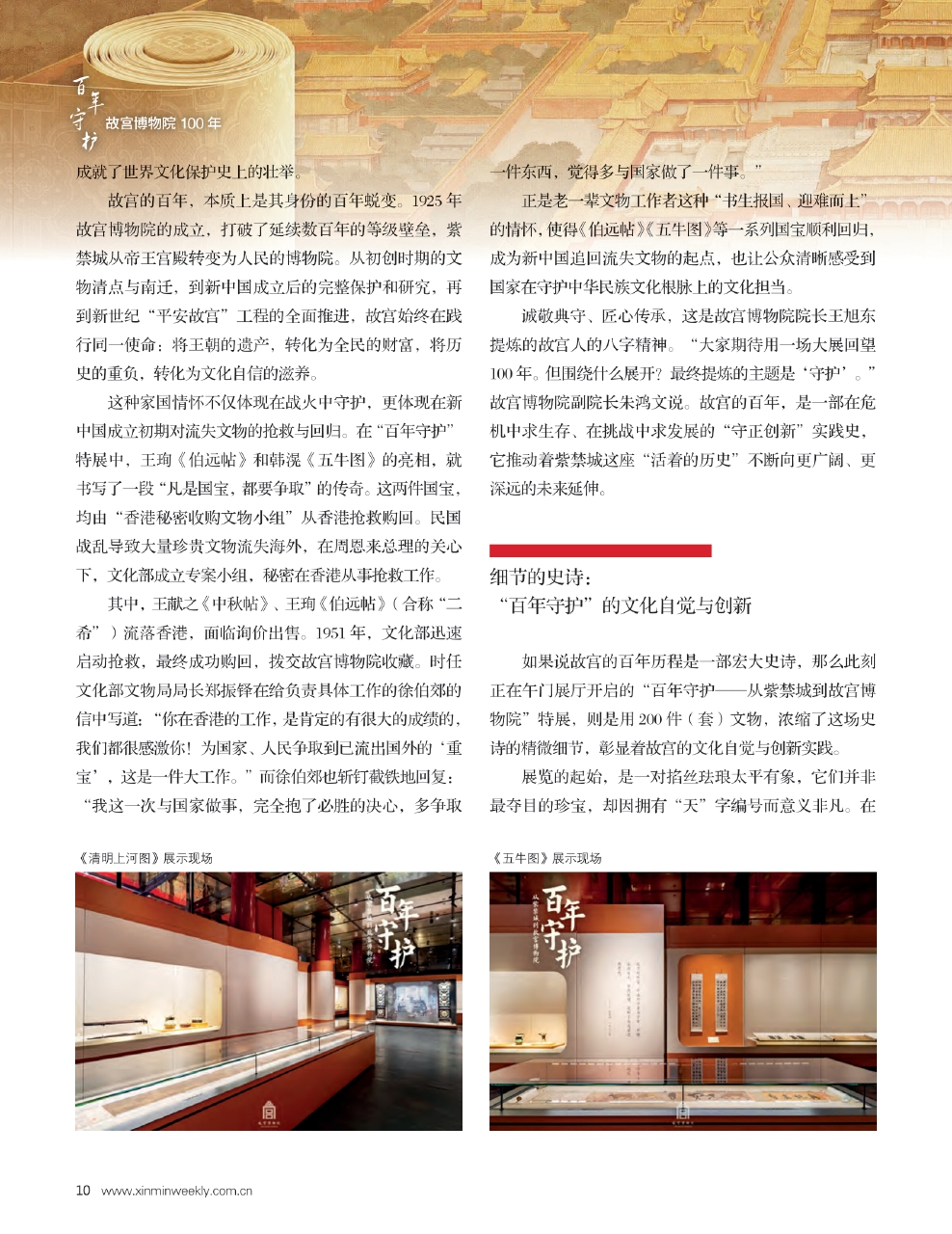 诚敬典守、匠心传承,这是故宫博物院院长王旭东提炼的故宫人的八字精神。“大家期待用一场大展回望100年。但围绕什么展开?最终提炼的主题是‘守护’。”故宫博物院副院长朱鸿文说。故宫的百年,是一部在危机中求生存、在挑战中求发展的“守正创新”实践史,它推动着紫禁城这座“活着的历史”不断向更广阔、更深远的未来延伸。