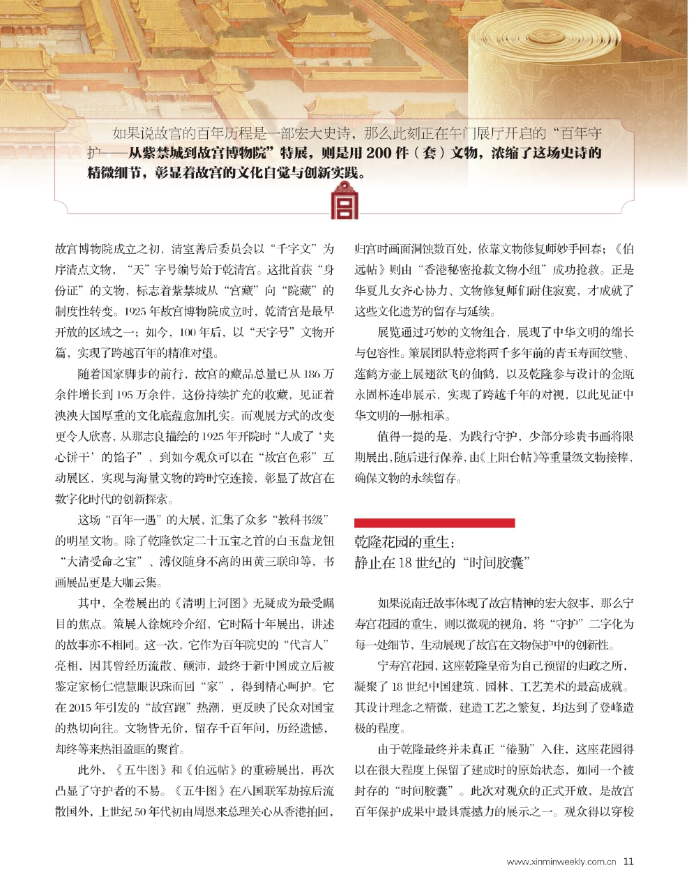 诚敬典守、匠心传承,这是故宫博物院院长王旭东提炼的故宫人的八字精神。“大家期待用一场大展回望100年。但围绕什么展开?最终提炼的主题是‘守护’。”故宫博物院副院长朱鸿文说。故宫的百年,是一部在危机中求生存、在挑战中求发展的“守正创新”实践史,它推动着紫禁城这座“活着的历史”不断向更广阔、更深远的未来延伸。