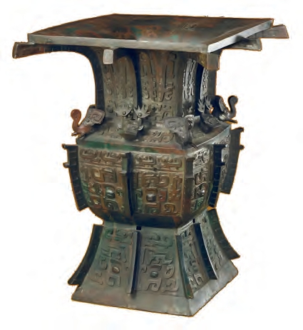 这是一件清宫旧藏,原藏颐和园。樽是盛酒器,流行于商早期至春秋战国时期。方形尊的规格很高,作为考古发掘品主要见于商代中期至西周早期的大墓和窖藏中。传世的“亚醜”铭器物主要出土于清代,多见于清宫的收藏,器型包括鼎、簋、尊、卣、彝、罍等。此件高45.5cm,宽38cm,口径33.6×33.4cm,重21.5kg。方形,侈口,鼓腹带扉棱,方足。肩四角饰四圆雕象首,象间为兽头。颈饰夔纹,腹、足饰夔纹和兽面纹,皆以云雷纹填地。器内壁近口处有铭文2行9字:“亚醜/者㚸(姒)以大子尊彝”,铭文大意:“亚醜”中一位嫁自“诸”族的年长女性铸作此器,以祭祀去世的太子(本族首领的长子)。1965—1966年,苏埠屯发现了带有四条墓道及亚字形椁室的商王级别大墓,出土了带有“亚醜”铭的大铜钺。可知亚醜族势力强大,主要活动于今青州一带,并与商王室保持着密切的联系。根据铭文字数由少到多以及河南安阳出土的同时代器物为参考,可判断此器物出现于商晚期。