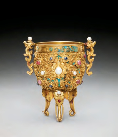 在故宫博物院中,皇家的尊贵与奢华渗透在宫廷生活的随时随处,无论是日用的器具,饮撰用具,还是陈设器物,无一不是造型复杂,用料贵重,制作考究。金瓯永固杯是清宫礼制用器,黄金质地,极为珍贵。此杯金质,鼎式,圆形,直口。口沿錾回纹一周,一面中部錾篆书“金瓯永固”,一面錾“乾隆年制”四字款。外壁满錾宝相花,花蕊以珍珠及红、蓝宝石为主。两侧各有一变形龙耳,龙头上有珠。三足皆为象首式,象耳略小,长牙卷鼻,额顶及双目间亦嵌珠宝。