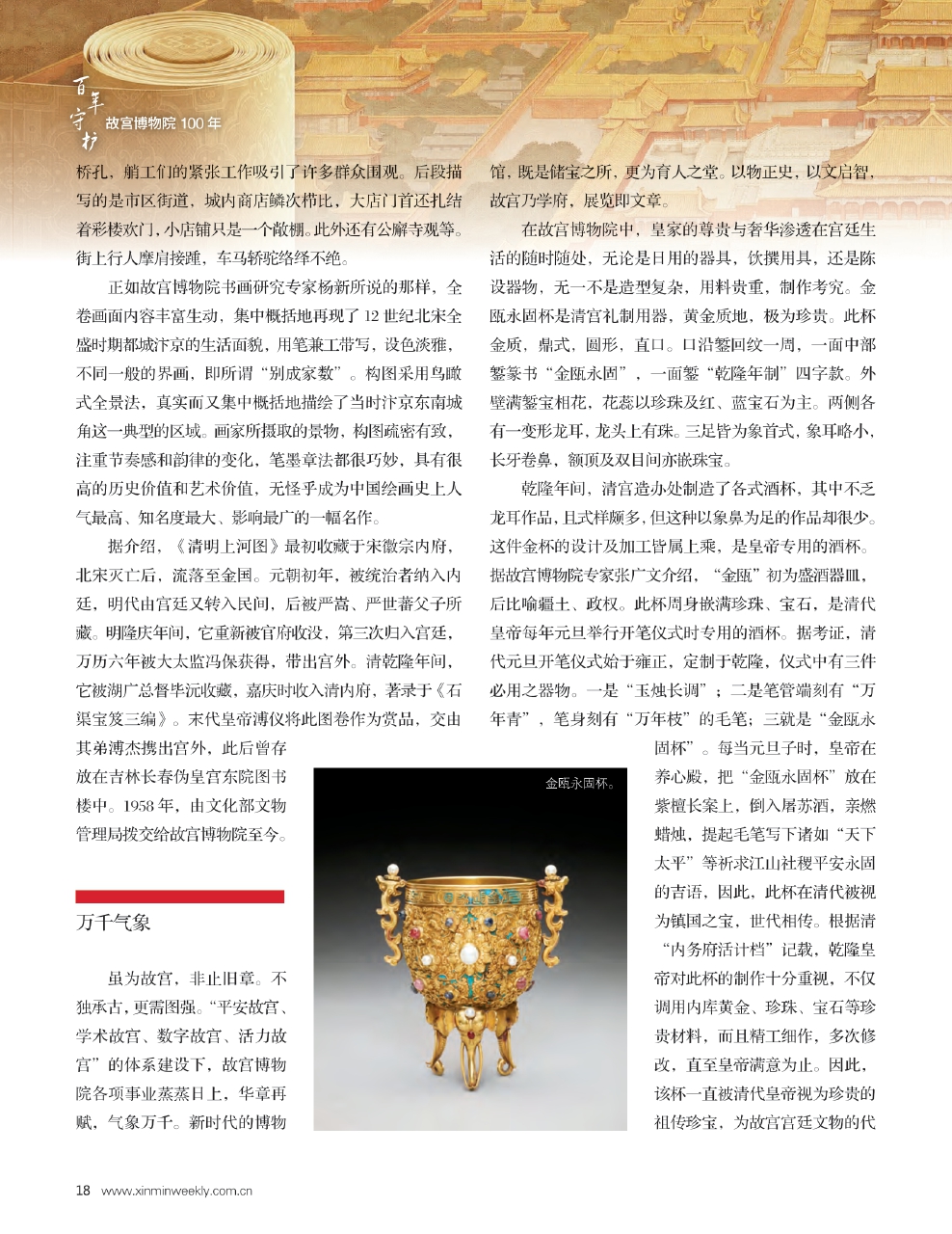 乾隆年间,清宫造办处制造了各式酒杯,其中不乏龙耳作品,且式样颇多,但这种以象鼻为足的作品却很少。这件金杯的设计及加工皆属上乘,是皇帝专用的酒杯。据故宫博物院专家张广文介绍,“金瓯”初为盛酒器皿,后比喻疆土、政权。此杯周身嵌满珍珠、宝石,是清代皇帝每年元旦举行开笔仪式时专用的酒杯。据考证,清代元旦开笔仪式始于雍正,定制于乾隆,仪式中有三件必用之器物。一是“玉烛长调”;二是笔管端刻有“万年青”,笔身刻有“万年枝”的毛笔;三就是“金瓯永固杯”。每当元旦子时,皇帝在养心殿,把“金瓯永固杯”放在紫檀长案上,倒入屠苏酒,亲燃蜡烛,提起毛笔写下诸如“天下太平”等祈求江山社稷平安永固的吉语,因此,此杯在清代被视为镇国之宝,世代相传。根据清“内务府活计档”记载,乾隆皇帝对此杯的制作十分重视,不仅调用内库黄金、珍珠、宝石等珍贵材料,而且精工细作,多次修改,直至皇帝满意为止。因此,该杯一直被清代皇帝视为珍贵的祖传珍宝,为故宫宫廷文物的代表作。