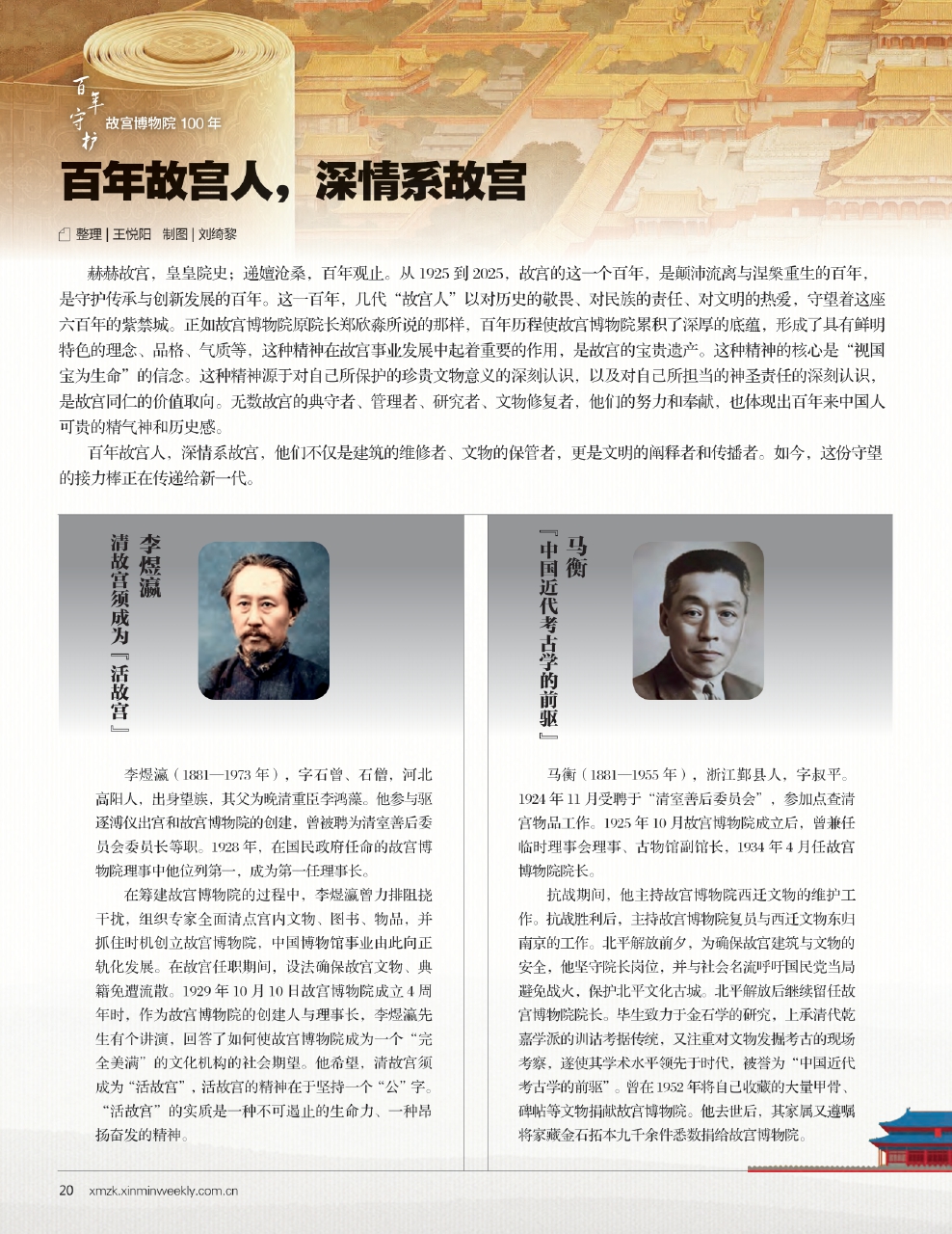 赫赫故宫,皇皇院史;递嬗沧桑,百年观止。从1925到2025,故宫的这一个百年,是颠沛流离与涅槃重生的百年,是守护传承与创新发展的百年。这一百年,几代“故宫人”以对历史的敬畏、对民族的责任、对文明的热爱,守望着这座六百年的紫禁城。正如故宫博物院原院长郑欣淼所说的那样,百年历程使故宫博物院累积了深厚的底蕴,形成了具有鲜明特色的理念、品格、气质等,这种精神在故宫事业发展中起着重要的作用,是故宫的宝贵遗产。这种精神的核心是“视国宝为生命”的信念。这种精神源于对自己所保护的珍贵文物意义的深刻认识,以及对自己所担当的神圣责任的深刻认识,是故宫同仁的价值取向。无数故宫的典守者、管理者、研究者、文物修复者,他们的努力和奉献,也体现出百年来中国人可贵的精气神和历史感。