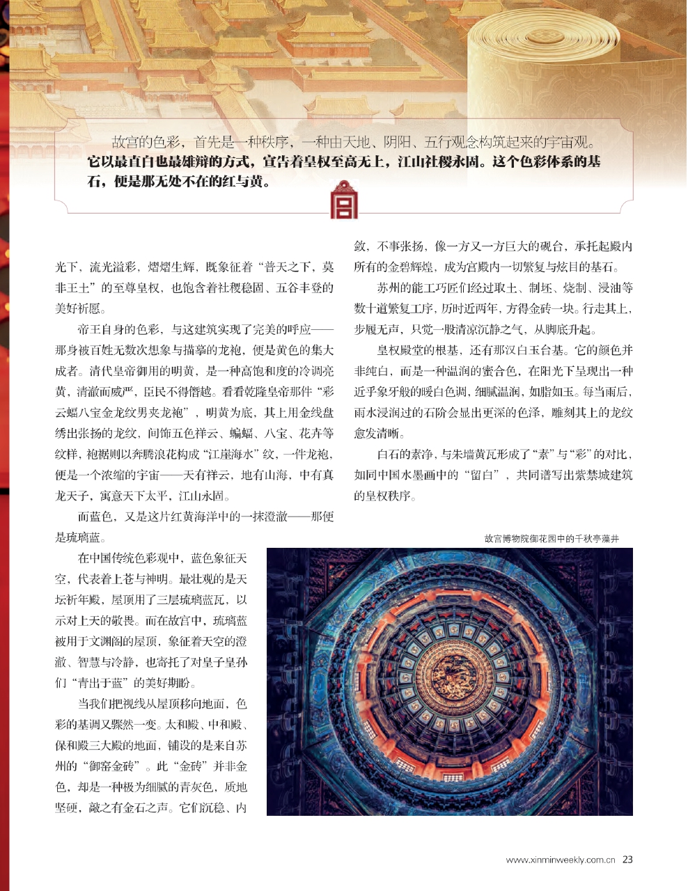从春花到冬雪,从草木到鸟兽,故宫的自然之色,与建筑的人工之色,形成了一种和谐的应和。在这里,皇权的威严与生命的温柔相互交织;历史的厚重也与四时的流转彼此唱和。这才是故宫调色盘的全部——它既是帝国秩序,也是匠人巧思,更是宇宙间生生不息的生命留痕——它用最中国的色彩,讲述了最中国的故事,也定义了最中国的美。
