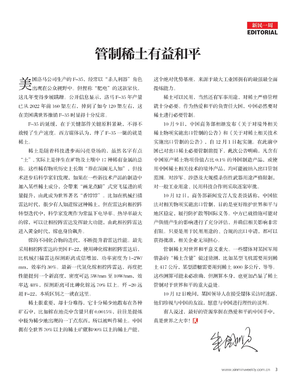 管制稀土对世界和平意义重大。一些媒体对某国军用装备的“稀土含量”做过猜测,比如某型飞机需要用到稀土417公斤,某型潜艇需要用到稀土4000多公斤,等等。这些测算可能未必准确,但测算本身,也更加凸显了稀土管制对于世界和平的重大益处。