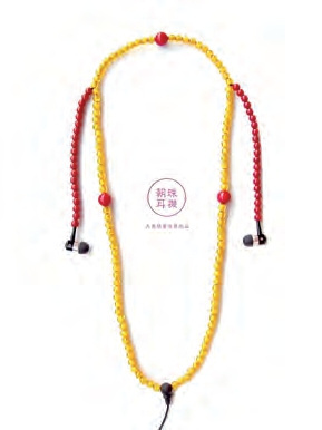 这款将清代象征身份与地位的朝珠与现代电子产品结合的创意产品,材料为仿蜜蜡,佩戴时外观为整圈朝珠,肩部两侧延伸出入耳式耳机。