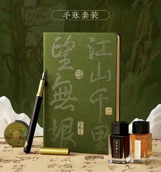 故宫文具推出的“千里江山望无垠手账套装”,将北宋王希孟的传世名画《千里江山图》元素注入到文具产品设计当中。封面印有乾隆皇帝御笔所书“江山千里望无垠”的笔记本,将北宋经典艺术、审美与现代世俗生活巧妙连接。