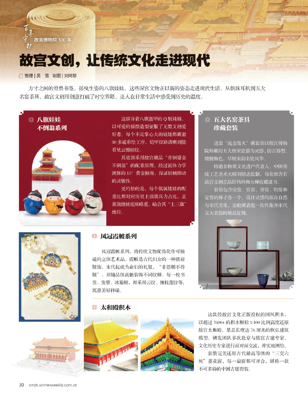 方寸之间的脊兽书签,摇曳生姿的八旗娃娃,这些深宫文物正以新的姿态走进现代生活。从朝珠耳机到五大名窑茶具,故宫文创用创意打破了时空界限,让人在日常生活中感受到历史的温度。