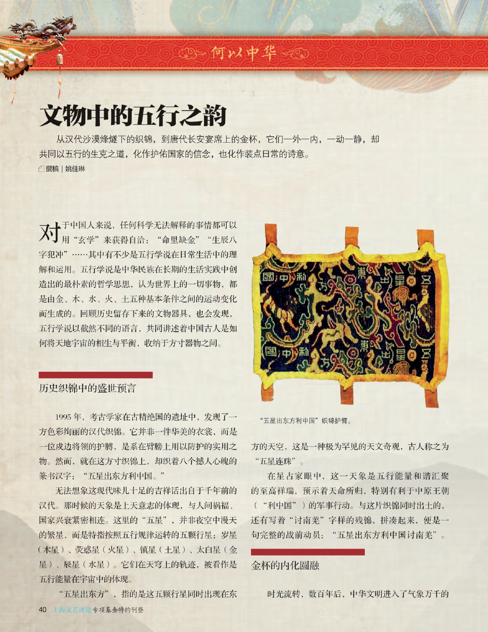 从汉代沙漠烽燧下的织锦,到唐代长安宴席上的金杯,它们一外一内,一动一静,却共同以五行的生克之道,化作护佑国家的信念,也化作装点日常的诗意。