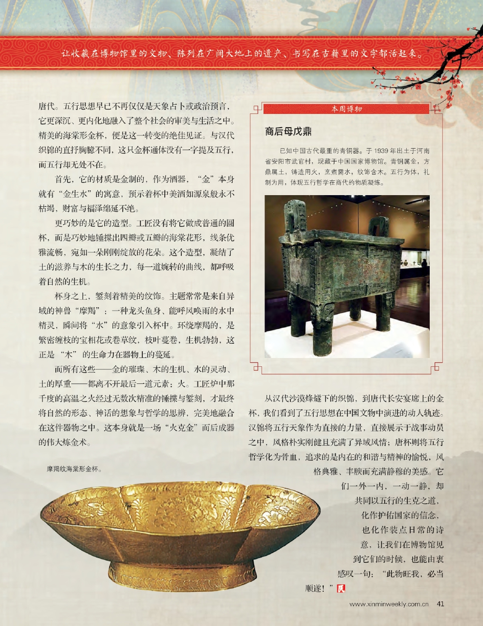 从汉代沙漠烽燧下的织锦,到唐代长安宴席上的金杯,我们看到了五行思想在中国文物中演进的动人轨迹。汉锦将五行天象作为直接的力量,直接展示于战事动员之中,风格朴实刚健且充满了异域风情;唐杯则将五行哲学化为骨血,追求的是内在的和谐与精神的愉悦,风格典雅、丰腴而充满静穆的美感。它们一外一内,一动一静,却共同以五行的生克之道,化作护佑国家的信念,也化作装点日常的诗意,让我们在博物馆见到它们的时候,也能由衷感叹一句:“此物旺我,必当顺遂!”