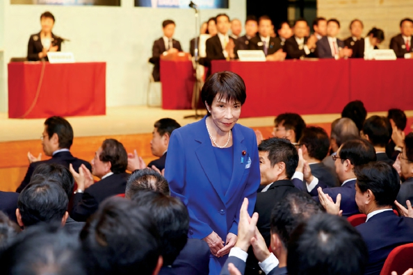 上图:10月4日,在日本东京的自民党总部,高市早苗(中)在自民党总裁选举中胜出后接受祝贺。