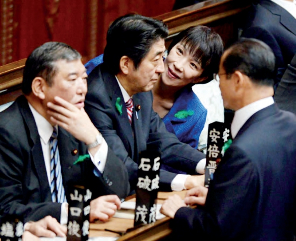 右图:2015年4月21日,在日本国会众议院,时任日本首相安倍晋三(左二)与时任总务大臣高市早苗(右二)商谈。