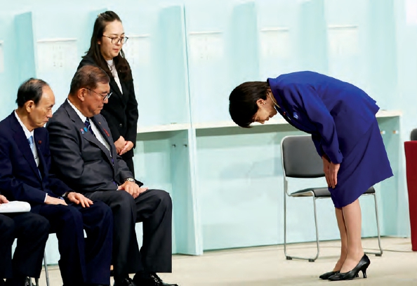 上图:10月4日,在日本东京的自民党总部,高市早苗(右一)在自民党总裁选举中胜出后鞠躬致意。