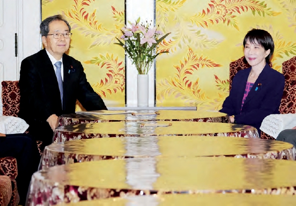 上图:日本自民党总裁高市早苗(右)与公明党党首齐藤铁夫于10月7日下午在日本国会举行联合执政磋商。