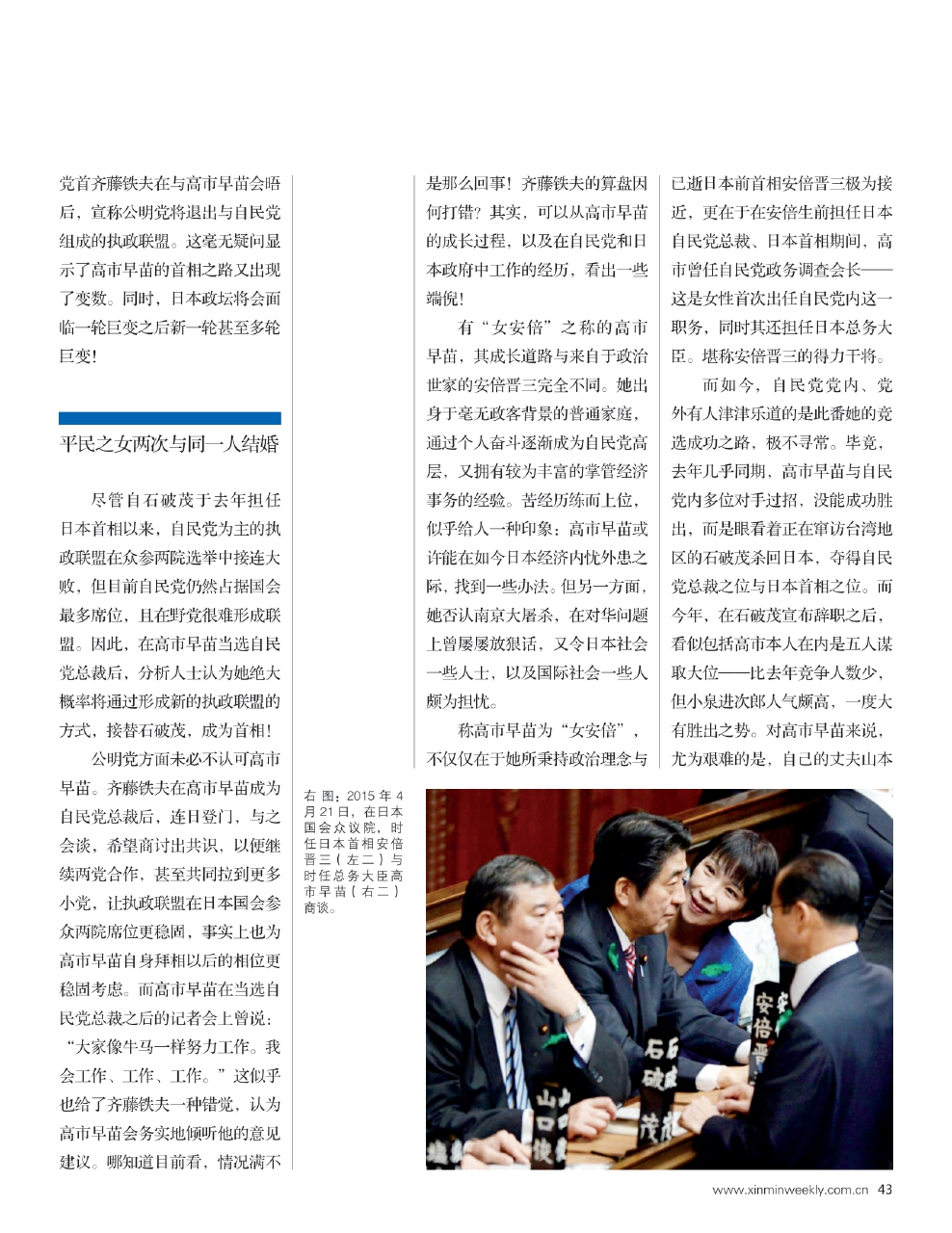 有“女安倍”之称的高市早苗,其成长道路与来自于政治世家的安倍晋三完全不同。她出身于毫无政客背景的普通家庭,通过个人奋斗逐渐成为自民党高层,又拥有较为丰富的掌管经济事务的经验。苦经历练而上位,似乎给人一种印象:高市早苗或许能在如今日本经济内忧外患之际,找到一些办法。但另一方面,她否认南京大屠杀,在对华问题上曾屡屡放狠话,又令日本社会一些人士,以及国际社会一些人颇为担忧。