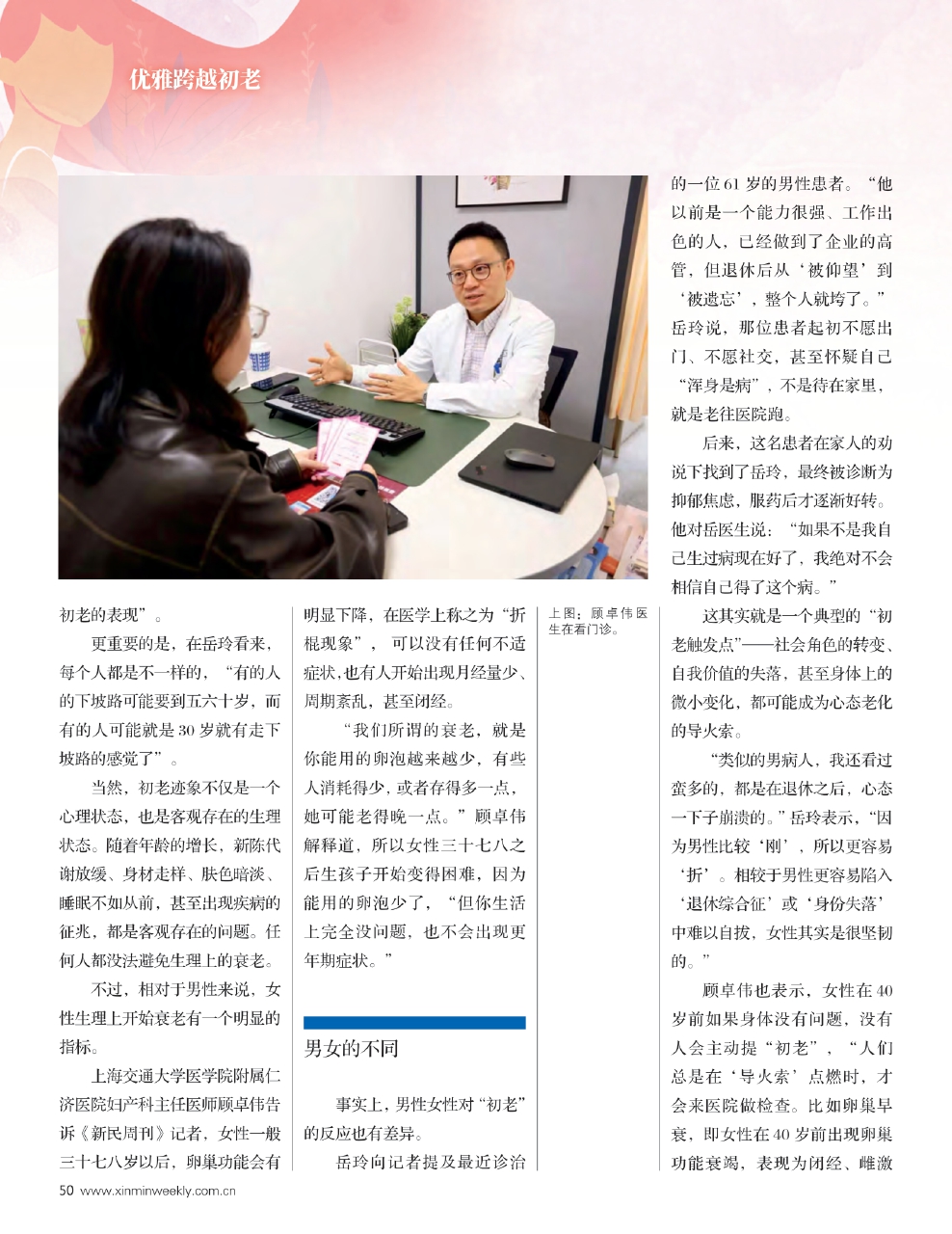 “你应该要知道什么状态下一定要看医生,或者应该要去管理。而什么情况下是可以和它坦然共存。对‘老’这件事不必过度焦虑,如今不少媒体反复强调更年期各种不适症状与各类疾病高发,导致很多人对更年期有点过度焦虑甚至恐惧了。”顾卓伟说,人们常常把更年期跟能力下降、脾气改变等缺点挂钩,“所以大家很恐惧进入更年期,实际上它是每个人都要经历的生理阶段”。