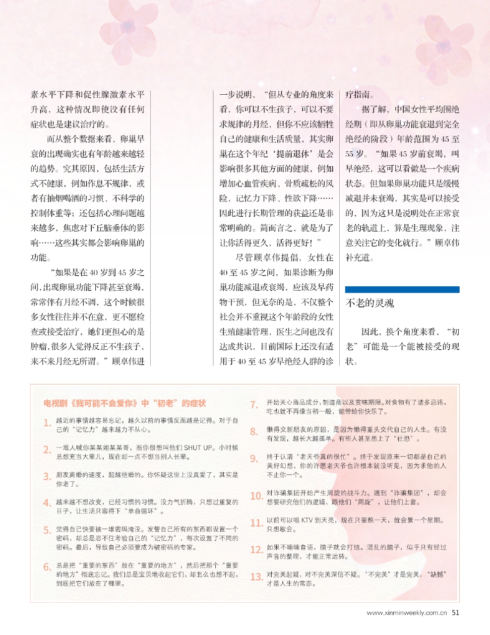 顾卓伟也表示,女性在40岁前如果身体没有问题,没有人会主动提“初老”,“人们总是在‘导火索’点燃时,才会来医院做检查。比如卵巢早衰,即女性在40岁前出现卵巢功能衰竭,表现为闭经、雌激素水平下降和促性腺激素水平升高,这种情况即使没有任何症状也是建议治疗的。