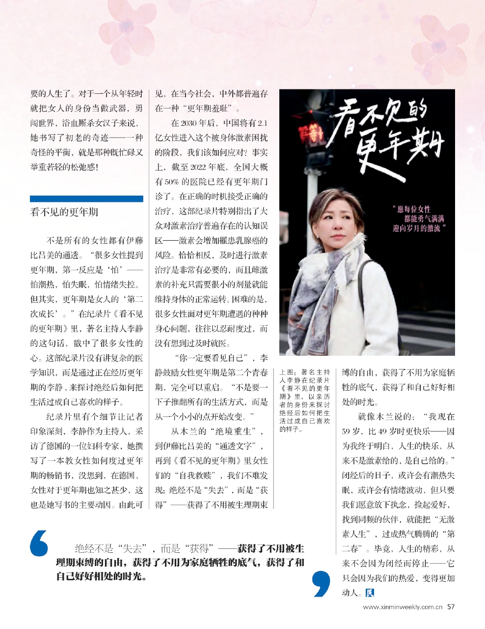上图:著名主持人李静在纪录片《看不见的更年期》里,以亲历者的身份来探讨绝经后如何把生活过成自己喜欢的样子。