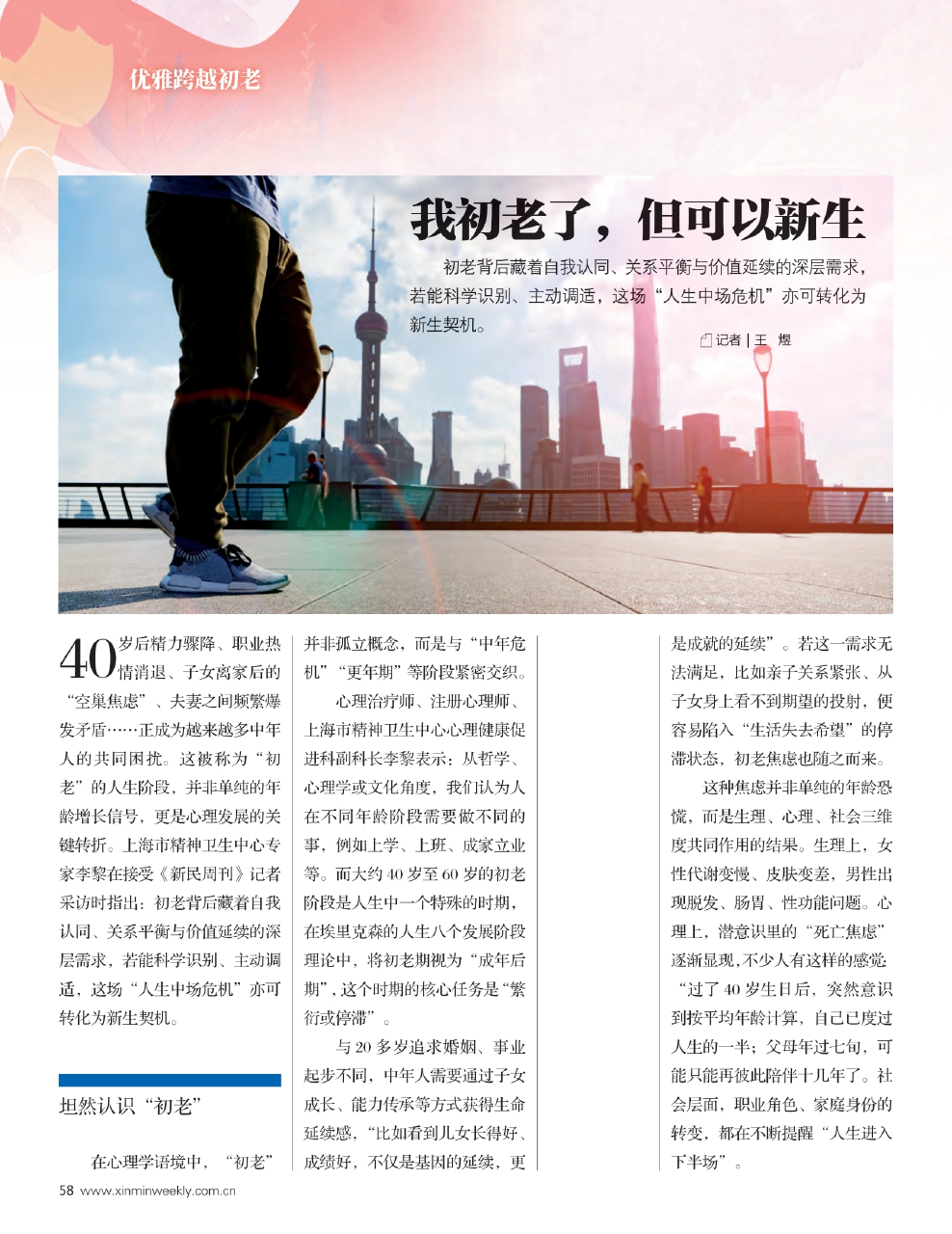 40岁后精力骤降、职业热情消退、子女离家后的“空巢焦虑”、夫妻之间频繁爆发矛盾……正成为越来越多中年人的共同困扰。这被称为“初老”的人生阶段,并非单纯的年龄增长信号,更是心理发展的关键转折。上海市精神卫生中心专家李黎在接受《新民周刊》记者采访时指出:初老背后藏着自我认同、关系平衡与价值延续的深层需求,若能科学识别、主动调适,这场“人生中场危机”亦可转化为新生契机。