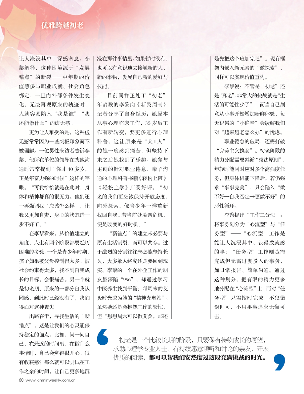 目前同样正处于“初老”年龄段的李黎向《新民周刊》记者分享了自身经历:她原本从事心理临床工作,35岁后工作有所转变,要更多进行心理科普,这让原来是“大I人”的她一度感到痛苦,但坚持下来之后她找到了乐趣。她参与主创的针对职业倦怠、亲子沟通的心理科普书籍《轻松上班》《轻松上学》广受好评。“初老的我们更应该保持开放态度,向外探索,像青少年一样重新找回自我。若当前处境遇危机,便是改变的好时机。”