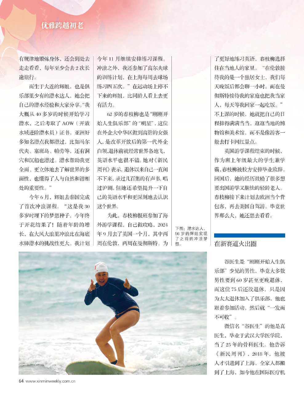 在日剧《重启人生》中,女主在车祸离世后不断重启人生,经历了公务员、药剂师、电视台制作人、科研人员和飞行员的不同职业。现实中,上海的一批60后70后群体主动选择退休后“重启人生”。《新民周刊》采访了其中的六位,从诗朗诵到画工笔画,从潜水到海外游学,从即兴喜剧到打碟,每个人都在尝试去探索一个全新领域。