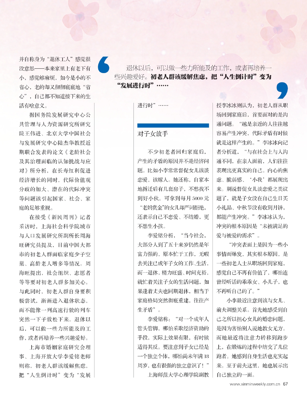 李爱铭则认为,初老者对待晚辈的态度要改变。子女未成年时,认为父母无所不能,父母也在以监护人的名义对子女进行强干预。但到了子女长大成人,父母到了初老阶段,随着社会权利的逐步减少,对子女的支持也该改为弹性支持。比如子女要结婚买房,父母可以资助,但未必一定要大包大揽。子女没有恋爱打算,父母不要紧盯强求。在李冰冰看来,退休后拘泥于子女是否恋爱等问题,是一种执念。
