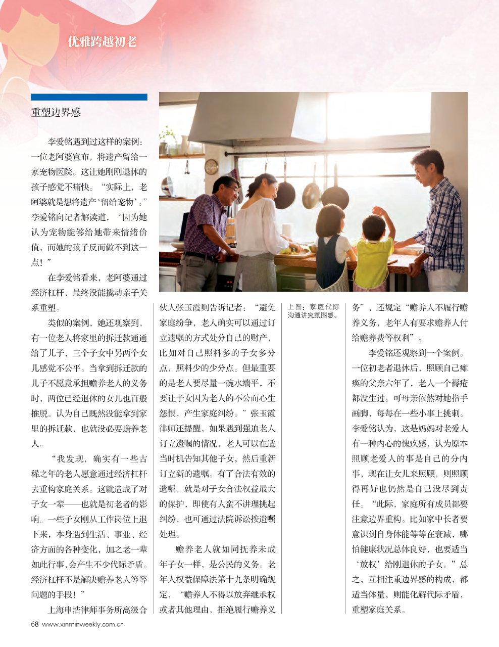 李爱铭还观察到一个案例。一位初老者退休后,照顾自己瘫痪的父亲六年了,老人一个褥疮都没生过。可母亲依然对她指手画脚,每每在一些小事上挑刺。李爱铭认为,这是妈妈对老爱人有一种内心的愧疚感,认为原本照顾老爱人的事是自己的分内事,现在让女儿来照顾,则照顾得再好也仍然是自己没尽到责任。“此际,家庭所有成员都要注意边界重构。比如家中长者要意识到自身体能等等在衰减,哪怕健康状况总体良好,也要适当‘放权’给刚退休的子女。”总之,互相注重边界感的构成,都适当体量,则能化解代际矛盾,重塑家庭关系。