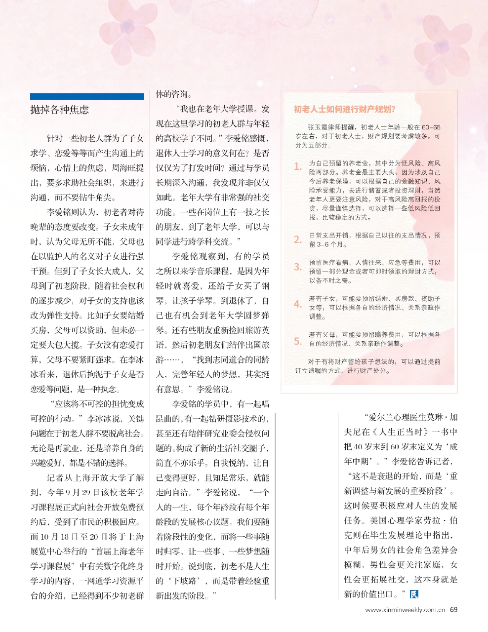 李爱铭的学员中,有一起唱昆曲的,有一起钻研摄影技术的,甚至还有结伴研究业委会侵权问题的。构成了新的生活社交圈子,简直不亦乐乎。自我悦纳,让自己变得更好,且知足常乐,就能走向自洽。”李爱铭说,“一个人的一生,每个年龄段有每个年龄段的发展核心议题。我们要随着阶段性的变化,而将一些事随时归零,让一些事、一些梦想随时开始。说到底,初老不是人生的‘下坡路’,而是带着经验重新出发的阶段。”