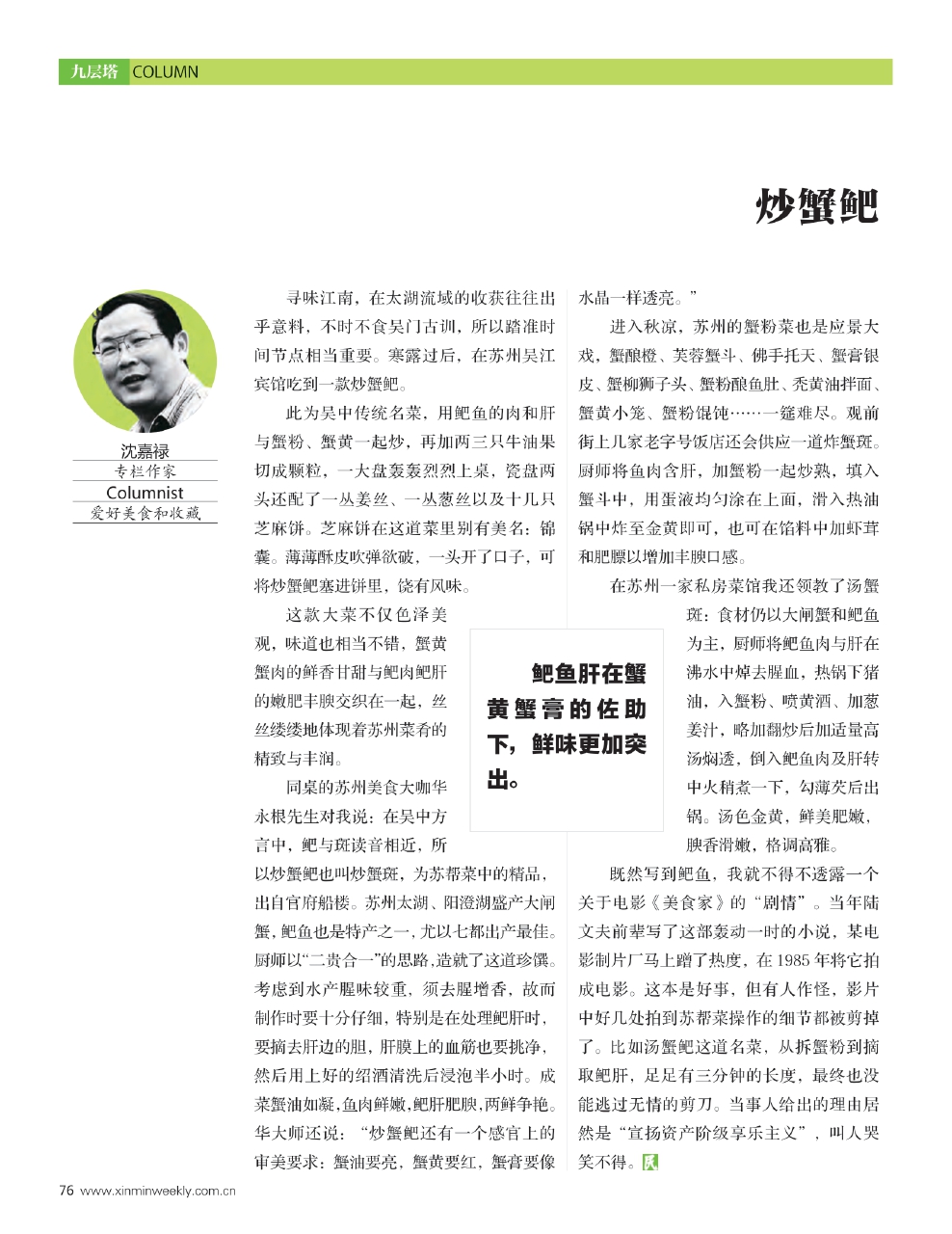 同桌的苏州美食大咖华永根先生对我说:在吴中方言中,鲃与斑读音相近,所以炒蟹鲃也叫炒蟹斑,为苏帮菜中的精品,出自官府船楼。苏州太湖、阳澄湖盛产大闸蟹,鲃鱼也是特产之一,尤以七都出产最佳。厨师以“二贵合一”的思路,造就了这道珍馔。考虑到水产腥味较重,须去腥增香,故而制作时要十分仔细,特别是在处理鲃肝时,要摘去肝边的胆,肝膜上的血筋也要挑净,然后用上好的绍酒清洗后浸泡半小时。成菜蟹油如凝,鱼肉鲜嫩,鲃肝肥腴,两鲜争艳。华大师还说:“炒蟹鲃还有一个感官上的审美要求:蟹油要亮,蟹黄要红,蟹膏要像水晶一样透亮。”