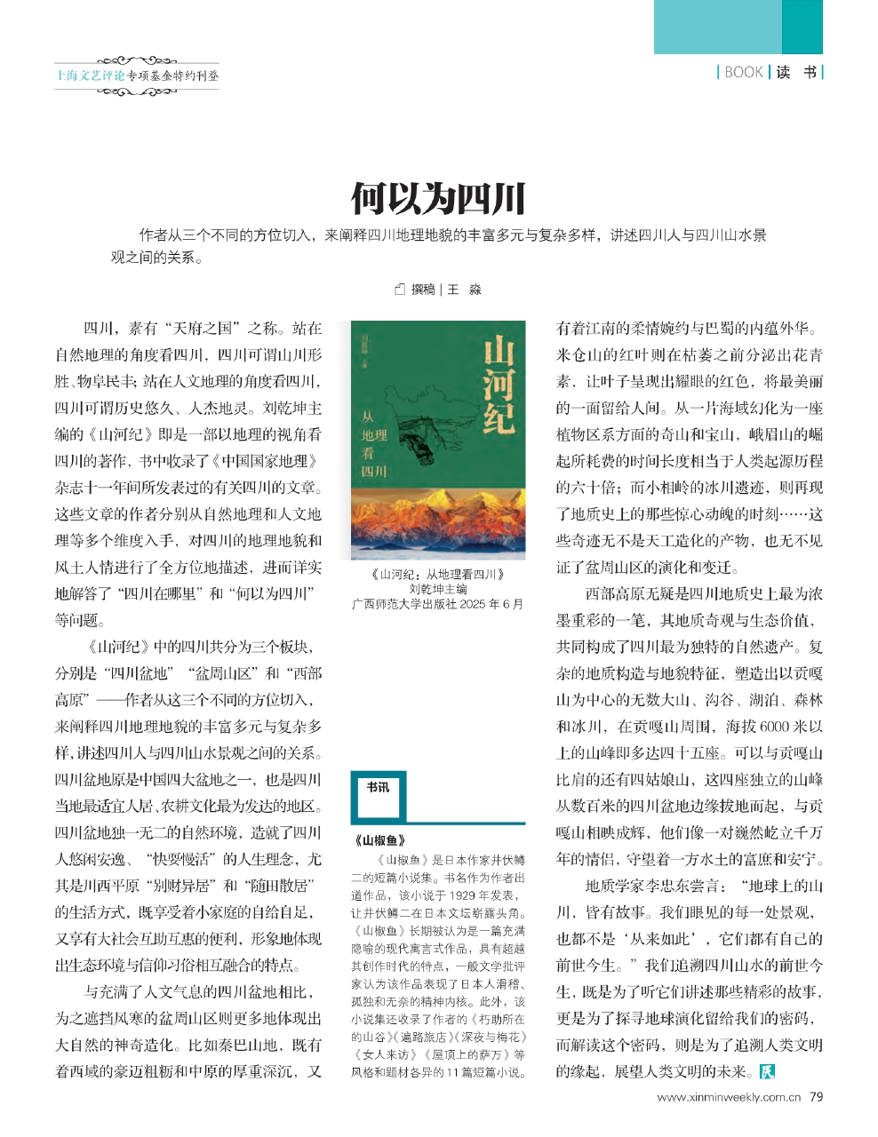 四川,素有“天府之国”之称。站在自然地理的角度看四川,四川可谓山川形胜、物阜民丰;站在人文地理的角度看四川,四川可谓历史悠久、人杰地灵。刘乾坤主编的《山河纪》即是一部以地理的视角看四川的著作,书中收录了《中国国家地理》杂志十一年间所发表过的有关四川的文章。这些文章的作者分别从自然地理和人文地理等多个维度入手,对四川的地理地貌和风土人情进行了全方位地描述,进而详实地解答了“四川在哪里”和“何以为四川”等问题。