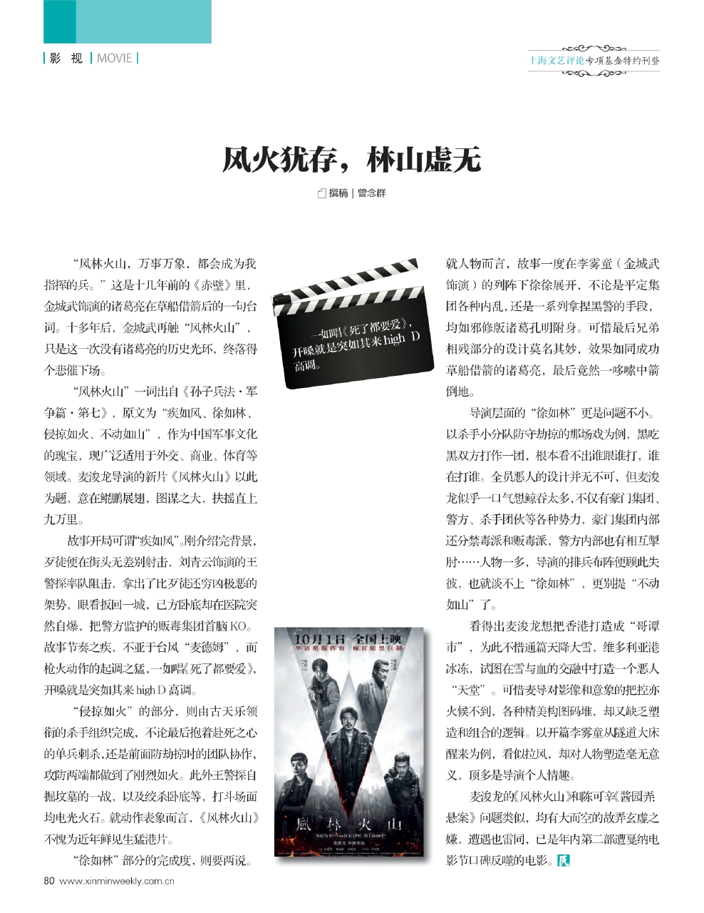 “风林火山”一词出自《孙子兵法·军争篇·第七》,原文为“疾如风、徐如林、侵掠如火、不动如山”,作为中国军事文化的瑰宝,现广泛适用于外交、商业、体育等领域。麦浚龙导演的新片《风林火山》以此为题,意在鲲鹏展翅,图谋之大,扶摇直上九万里。